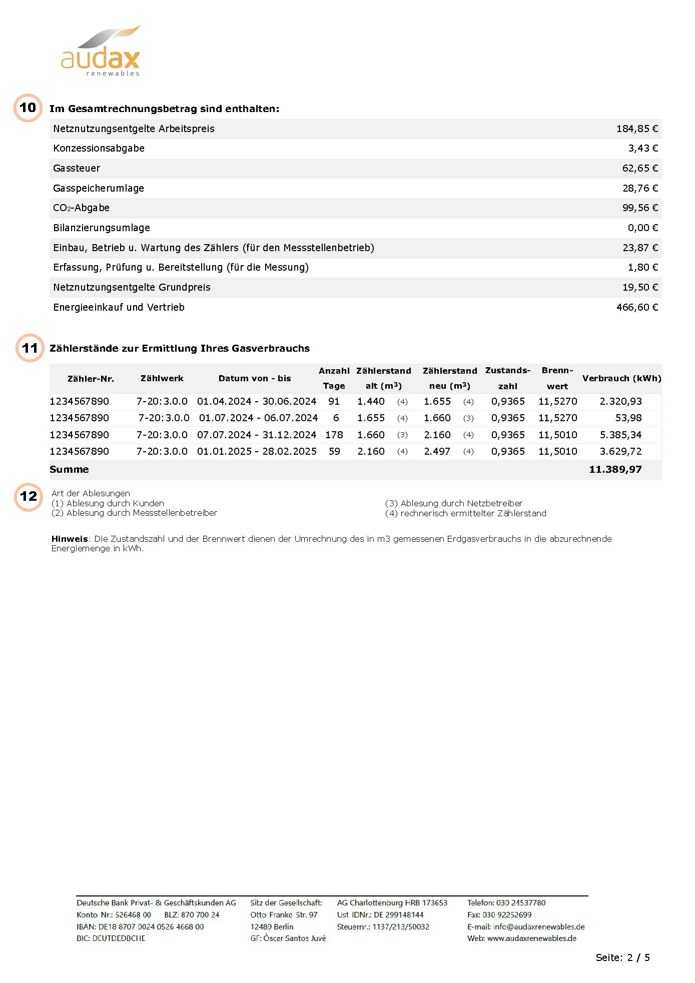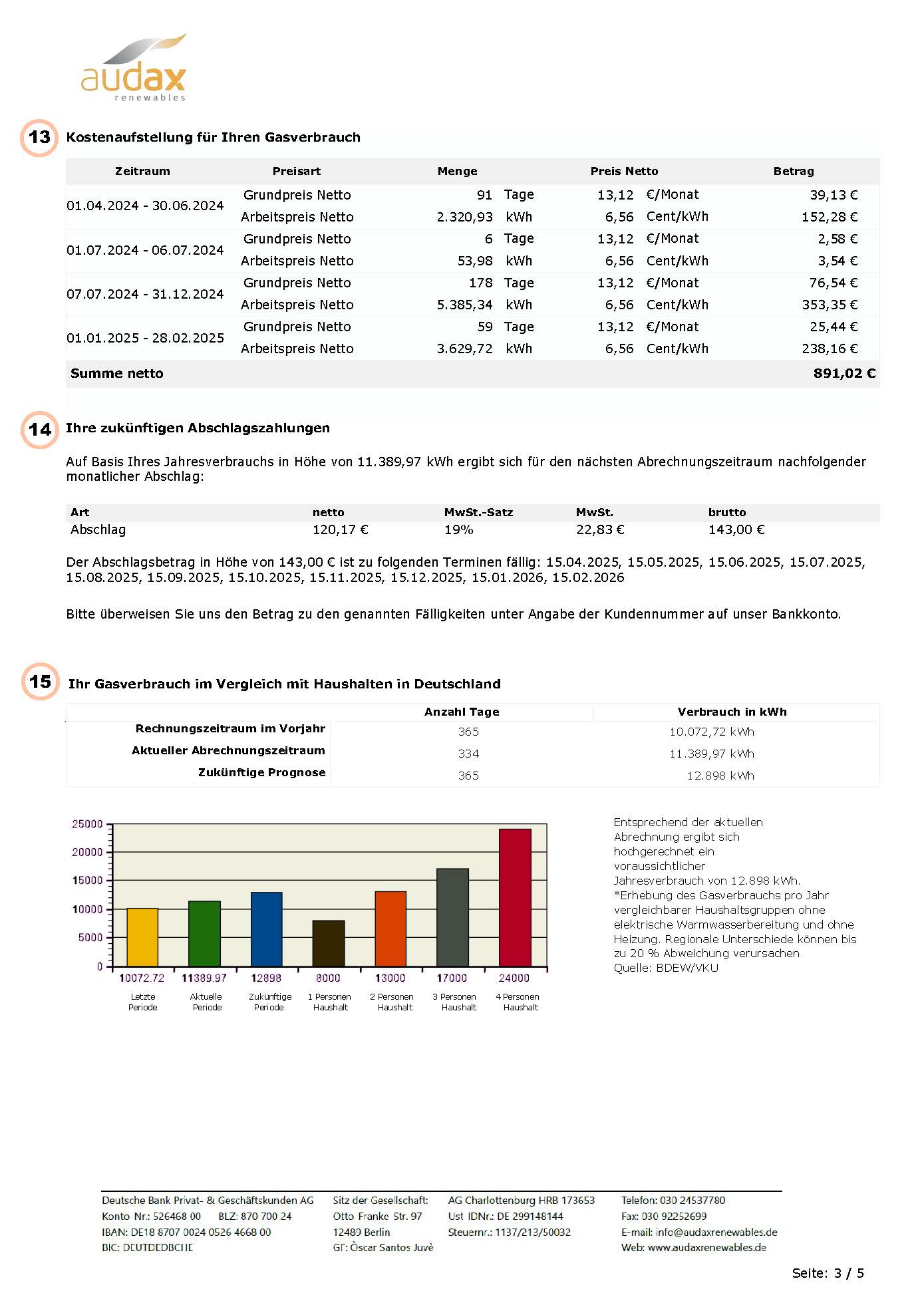 In dieser Tabelle sehen Sie, wie sich Ihre Gaskosten im Detail zusammensetzen. Angegeben sind die Zeiträume, die verbrauchte Menge in Kilowattstunden (kWh) sowie die jeweiligen Preise pro Einheit. So erkennen Sie genau, welche Kosten für Grundpreis (ein fixer Betrag, unabhängig vom Verbrauch) und Arbeitspreis (pro verbrauchte kWh) angefallen sind. Am Ende der Tabelle wird die Nettosumme aller Positionen angezeigt. Darauf wird anschließend die Mehrwertsteuer berechnet, bevor der Endbetrag entsteht.